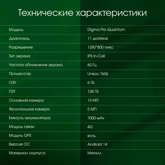 Планшет Digma Pro Quantum T606 (1.6) 8C RAM6Gb ROM128Gb 11" In-Cell 1280x800 4G 2Sim Android 14 серый 13Mpix 5Mpix BT WiFi microSD 2Tb 7000mAh [TA2D5P01]