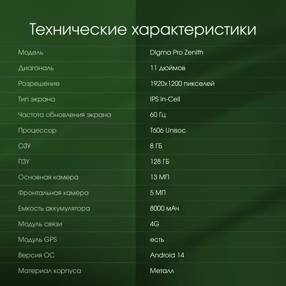 Планшет Digma Pro Zenith T606 (1.6) 8C RAM8Gb ROM128Gb 11" IPS 1920x1200 4G 2Sim Android 14 графит 13Mpix 5Mpix BT WiFi microSD 1Tb 8000mAh [TA3D1P01]