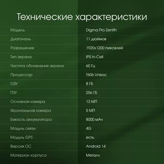 Планшет Digma Pro Zenith T606 (1.6) 8C RAM8Gb ROM256Gb 11" IPS 1920x1200 4G 2Sim Android 14 графит 13Mpix 5Mpix BT WiFi microSD 1Tb 8000mAh [TA3E1P01]