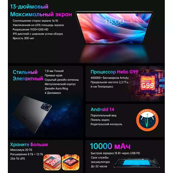 Планшет Teclast T65Max Premium set G99 (2.0) 8C RAM8Gb ROM256Gb 12.95" IPS 1920x1200 4G 2Sim Android 14 серебристый 13Mpix 8Mpix BT WiFi microSD 1Tb 10000mAh 32hr