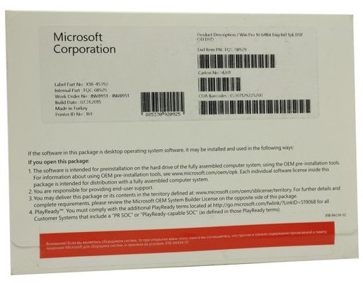 Описание Операционная система Microsoft Windows 10 Pro 64-bit Eng. OEM [FQC-08929]
