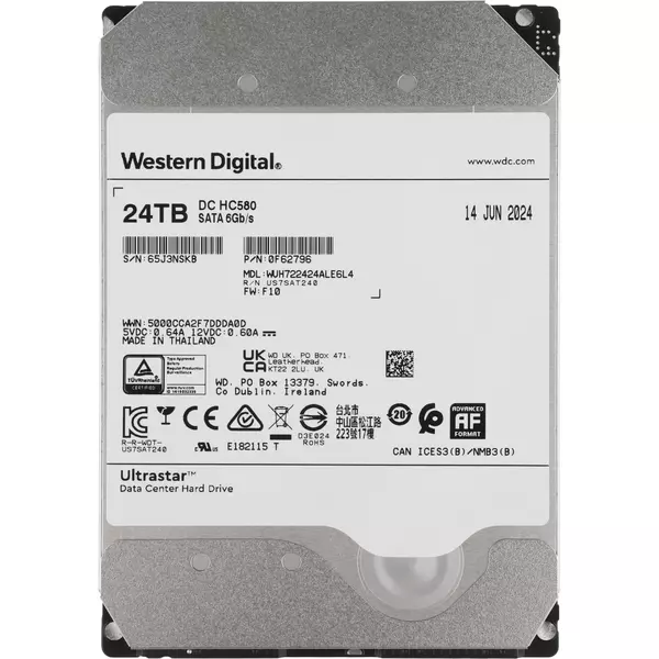 Жесткий диск серверный Western Digital 24Tb Ultrastar DC HC580 3.5" 7200RPM SATA3 6Gb/s and 512MB Cache [WUH722424ALE6L4]