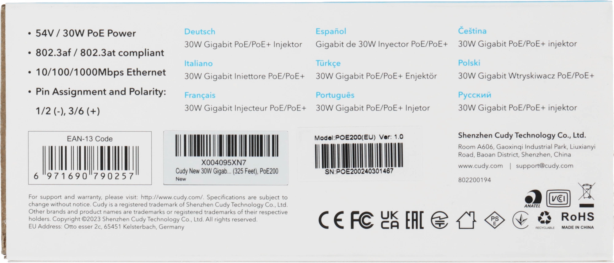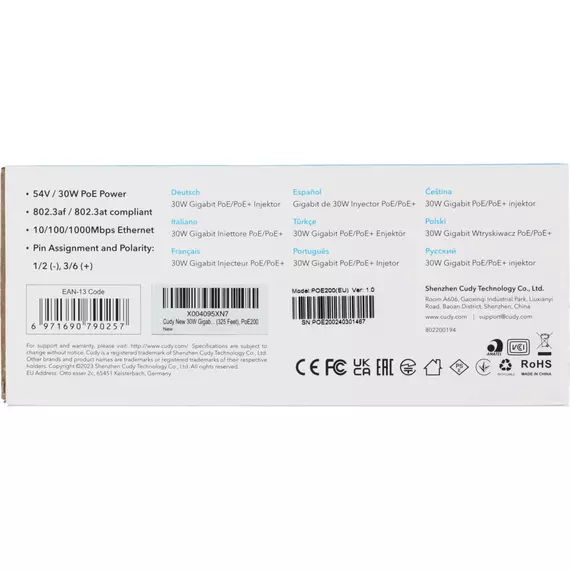 Инжектор PoE Cudy POE200 10/100/1000BASE-T 30Вт 54В(DC)