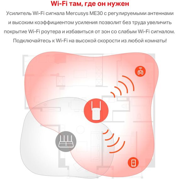 Усилитель Wi-Fi сигнала Mercusys ME30 с регулируемыми антеннами и высоким коэффициентом усиления позволит без труда увеличить покрытие Wi-Fi роутера и избавиться от зон со слабым Wi-Fi сигналом. Подключайтесь к Wi-Fi на высокой скорости из любой комнаты!