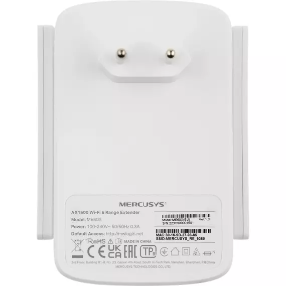 Повторитель беспроводного сигнала Mercusys ME60X AX1500, 10/100/1000BASE-TX, белый