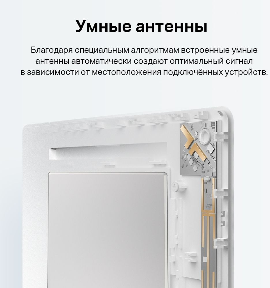 Два диапазона Wi-Fi — до 574 Мбит/с на 2,4 ГГц, до 2402 Мбит/с на 5 ГГц. Умные антенны. Включение (выключение) Wi-Fi. Управление доступом. Управление индикаторами. Работа по расписанию. Регулировка мощности Wi-Fi. EasyMesh.