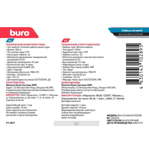 Кабель сетевой BURO BU-CCA-050-OUTDOOR UTP 4 пары cat.5E solid 0.50мм CCA 305м черный outdoor