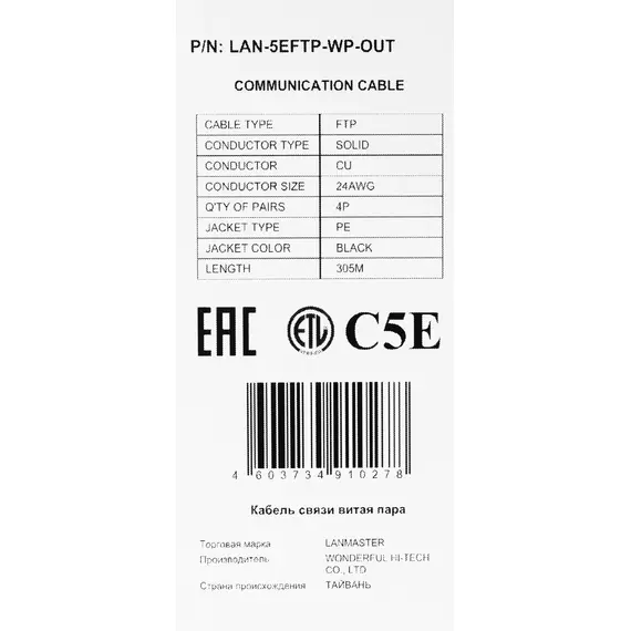 Кабель Lanmaster LAN-5EFTP-WP-OUT кат.5E FTP 4 пары 24AWG PE внешний 305м