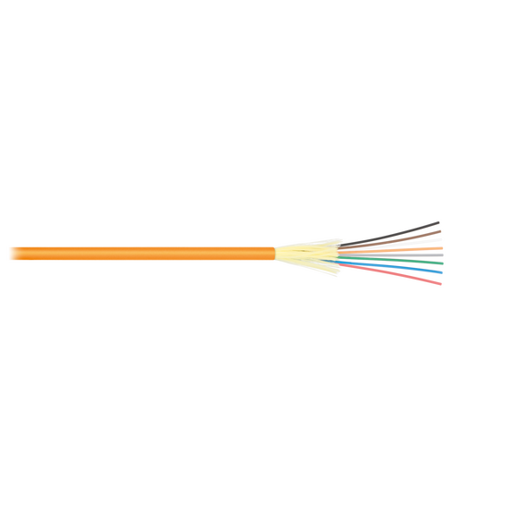 Распределительные оптические кабели, усиленные арамидными нитями, предназначены для прокладки внутри зданий, в кабельных лотках и каналах, трубах и блоках. Используются при построении магистральной кабельной подсистемы здания. Кабели NKL-F-xxxM2I-00C-OR содержат четыре, восемь или шестнадцать оптических волокона в плотном буфере, соответствующих стандарту ISO/IEC 11801 OM2. Поверх волокон накладываются арамидные нити и внешняя оболочка. Оболочка выполнена из нераспространяющего горение, малодымного, с низкой токсичностью продуктов горения, полимерного материала