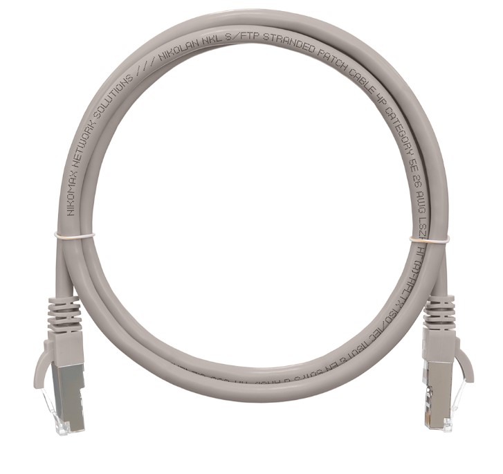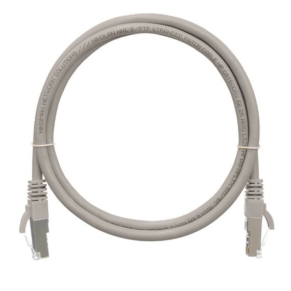 Коммутационный шнур Nikolan NMC-PC4SD55B-100-C-GY F/UTP 4 пары, Кат.5е (Класс D), 100МГц, 2хRJ45/8P8C, T568B, заливной, с защитой защелки, многожильный, BC (чистая медь), 26AWG (7х0,165мм), LSZH нг(А)-HFLTx, серый, 10м