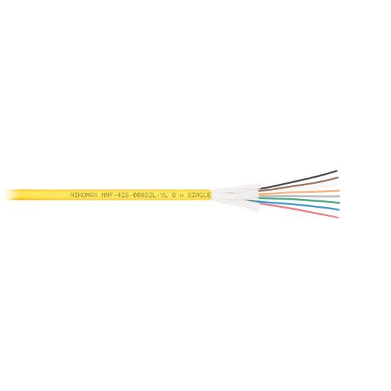 Кабель волоконно-оптический Nikolan NMF-4IS-024S2L-YL 24 волокна, одномодовый 9/125мкм, стандарта OS2, внутренний, распределительный, с плотным буфером, силовой элемент — стеклонити, полимерный материал нг(A)-LSLTx, желтый