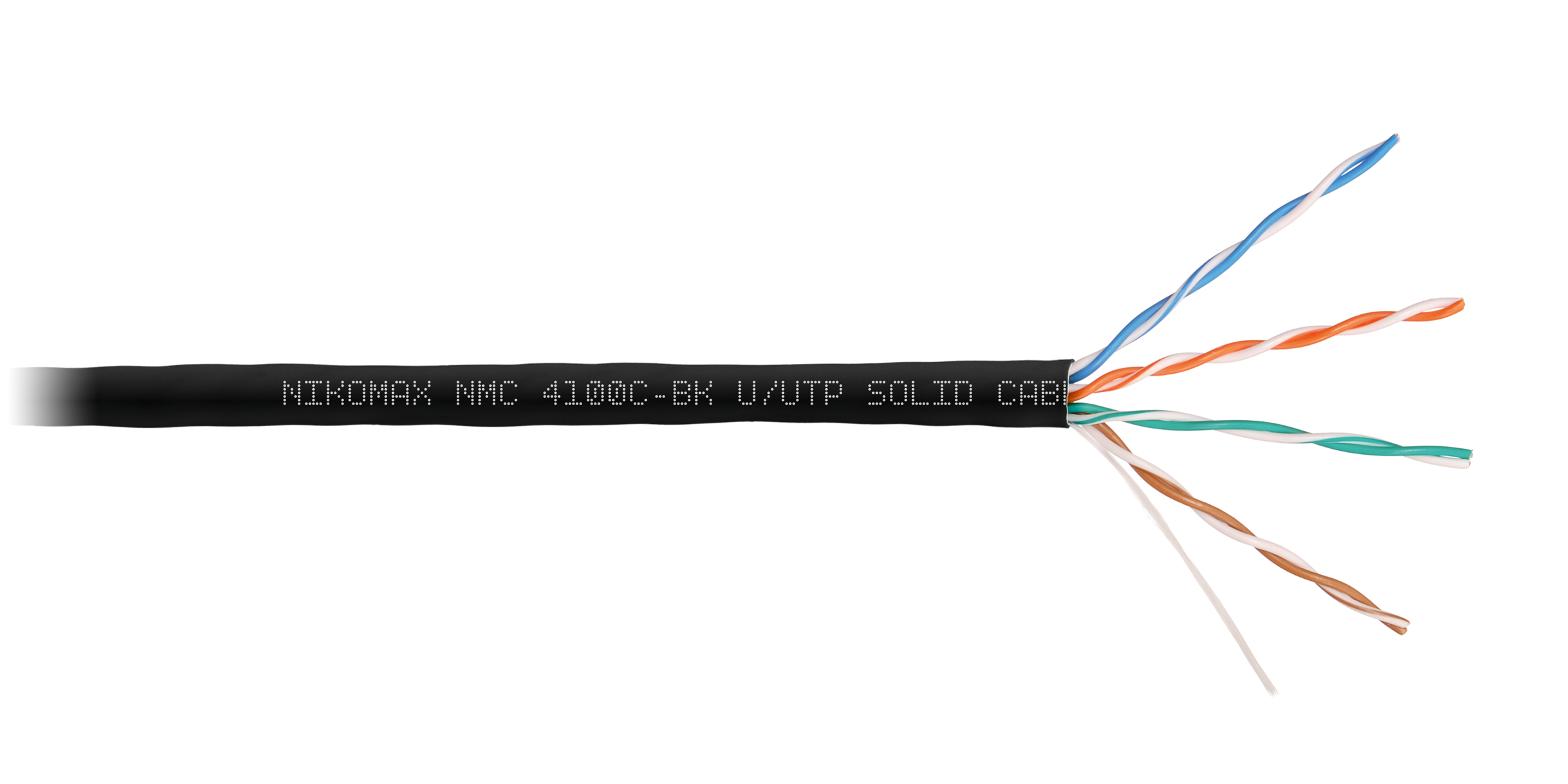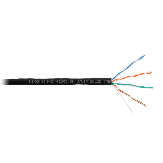 Кабель Nikomax NMC 4100C-BK U/UTP 4 пары, Кат.5e (Класс D), тест по ISO/IEC, 100МГц, одножильный, BC (чистая медь), 24AWG (0,51мм), полимерный материал нг(А)-HF, внутренний/внешний, черный, 305м