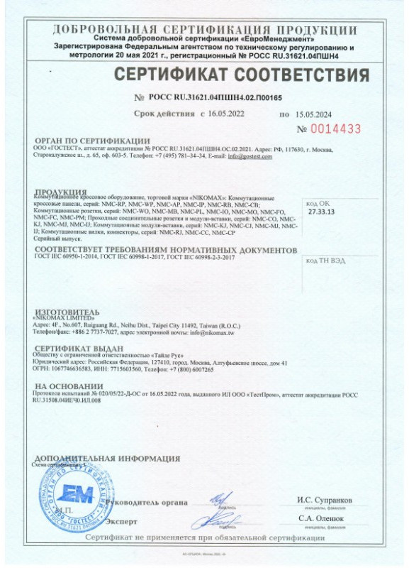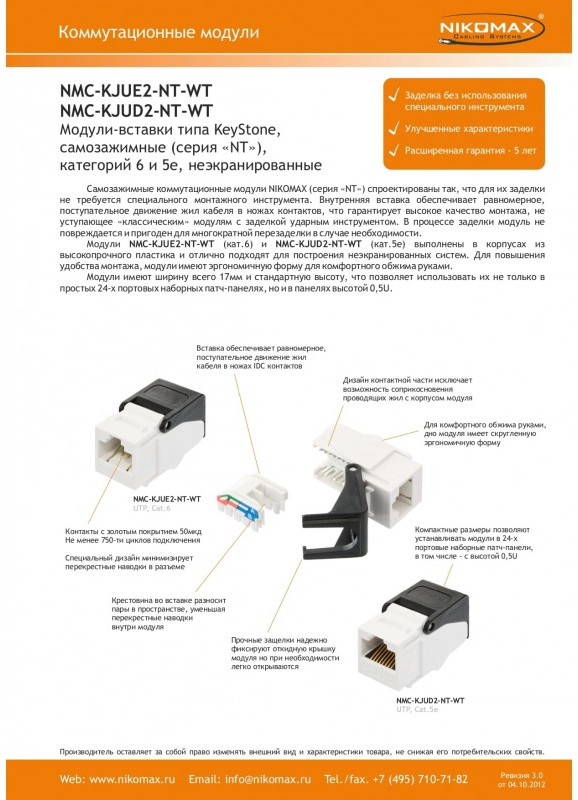 - Гарантия: 5 лет – расширенная; 25 лет – в составе сертифицированной СКС NIKOMAX