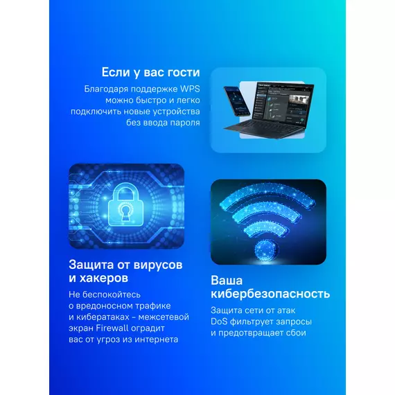 | Средства защиты сети | DMZ, DoS, Firewall, NAT, SPI, гостевая сеть, родительский контроль |
