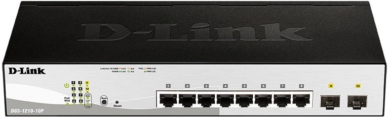 Коммутатор D-link DGS-1210-10P /FL2A (L2+) 8x1Гбит/с 2xКомбо(1000BASE-T/SFP) 8PoE 8PoE+ 65W управляемый