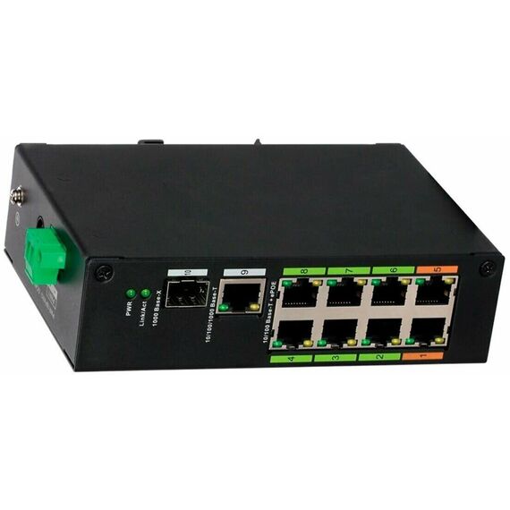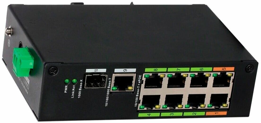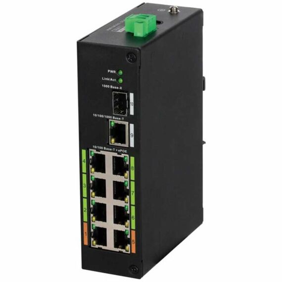 8-портовый неуправляемый коммутатор с ePoE Порты: 8 RJ45 10/100/1000Мбит/с (PoE/PoE+/Hi-PoE), 1 RJ45 10/100/1000Мбит/с (uplink), 1 SFP 100/1000Мбит/с (uplink); мощность PoE: порты 1 и 5 до 60Вт, порты 2~4 и 6~8 до 30Вт, суммарно до 120Вт; питание: 48~57В(DC); рабочая температура: -30°С~+65°С; монтаж на DIN-рейку; длина кабеля UTP до 800