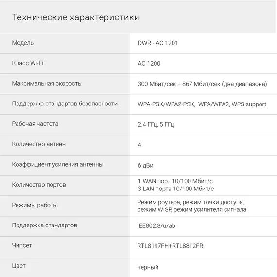| Класс Wi-Fi | AC1200 |