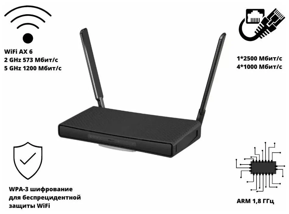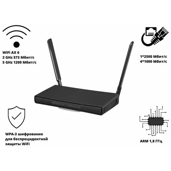Mikrotik C53UiG+5HPaxD2HPaxD - это мощный двухдиапазонный маршрутизатор с поддержкой Wi-Fi 6 (AX1800), который идеально подходит для дома или небольшого офиса.