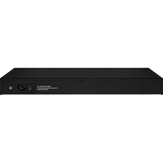 - Порты: 24 x FE (10/100 Base-T) с поддержкой PoE (IEEE 802.3af/at), 4 x GE Combo Uplink (RJ45 + SFP)