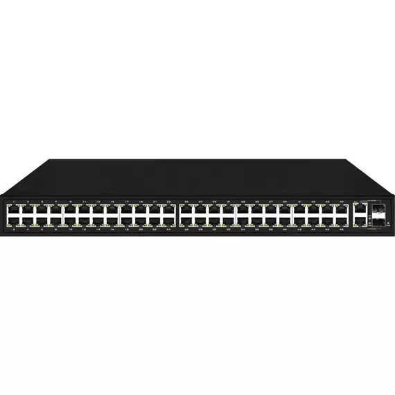 - Порты: 48 x FE (10/100 Base-T) с поддержкой PoE (IEEE 802.3af/at), 2 x GE Combo Uplink (RJ45 + SFP)