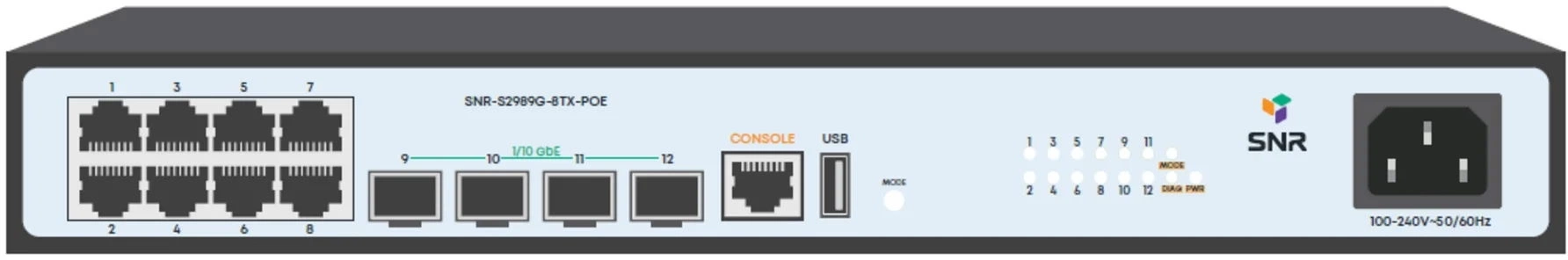 | Особенности | Управляемый PoE коммутатор уровня 2 SNR-S2989G-8TX-POEналичие USB-порта для подключения внешних накопителей |