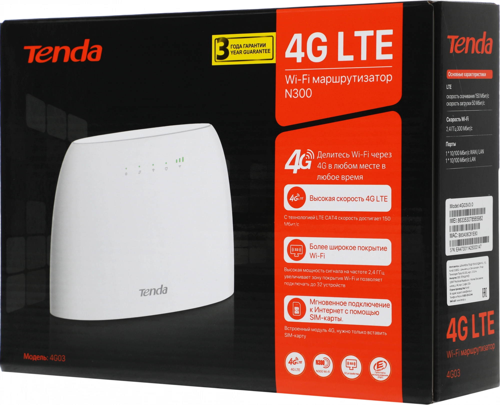 | Особенности | С технологией LTE CAT4, Tenda 4G03 достигает скорости до 150 Мбит\с . Наслаждайтесь просмотром фильмов в формате HD, моментальной загрузкой файлов, плавной видеосвязью без задержек и прерываний. |