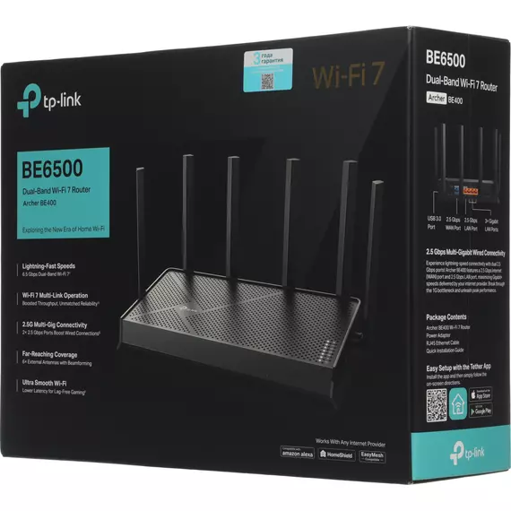| Комплектация | Маршрутизатор TP-Link Archer BE400, адаптер питания, кабель Ethernet RJ45, руководство по быстрой установке. |
