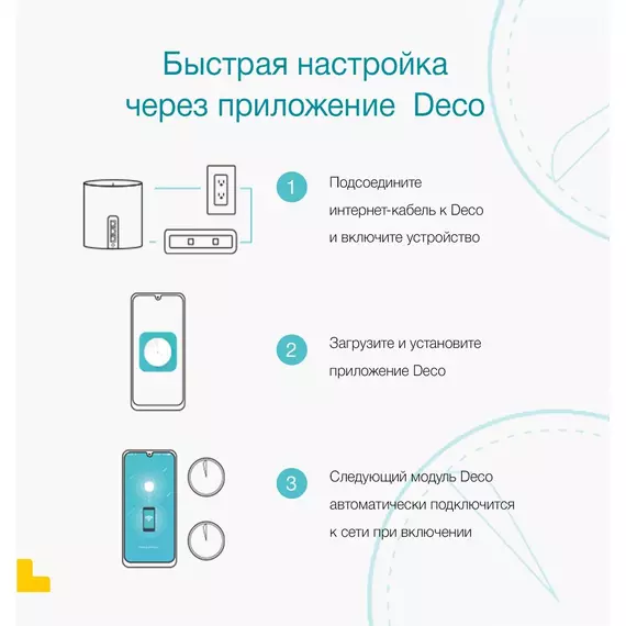 КомплектацияDeco X50 (3 шт.), Кабель Ethernet RJ45, Адаптер питания (3 шт.), Руководство по быстрой настройке