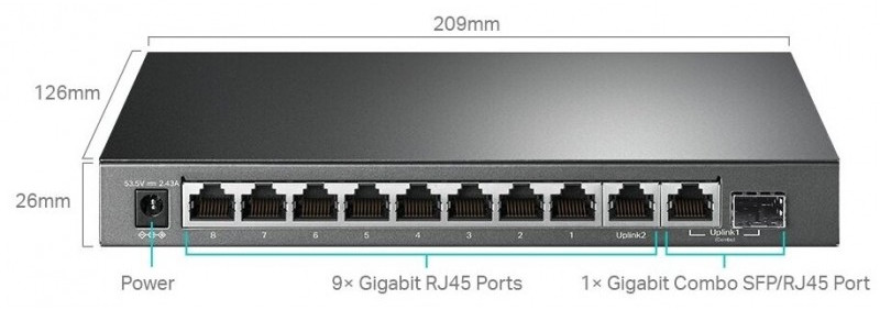 - Гигабитные порты: 9 портов 10/100/1000 Мбит/сек, 8 из них PoE+, 1 из них разделяемый с SFP