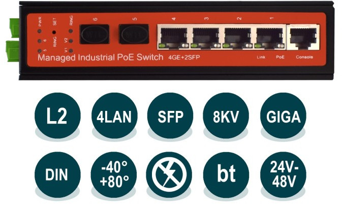 - Промышленный управляемый L2 коммутатор WI-PMS306GF-I предназначен для применения в индустриальных сетях предприятий. Коммутатор оснащен 4 портами 10/100/1000Base-Т с поддержкой PoE различных стандартов 802.3at/af/bt, Passive PoE 24В/48В и 2 портами SFP, сухими контактами, температурным датчиком, защищен от грязи, устойчив к электромагнитным помехам, нестабильному входному напряжению и сложным климатическим условиям.