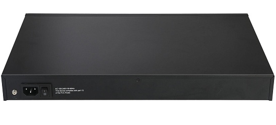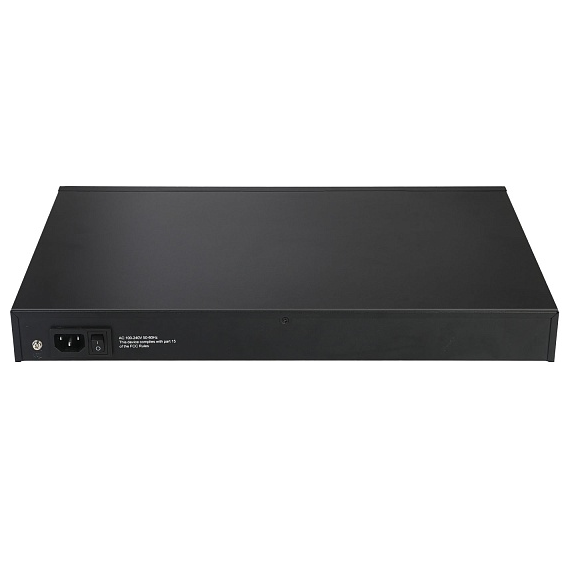 - Коммутатор оснащен 24 портами 1000Base-T стандарта 802.3af/at (PoE, PoE+) 400 Вт, 4 комбо портами SFP/1000Base-T, 1 консольным портом.