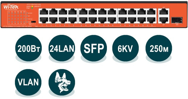 - Коммутатор поддерживает режим работы CCTV, VLAN и функцию Watchdog