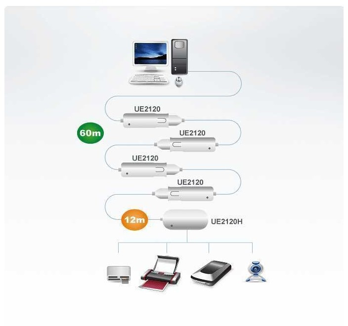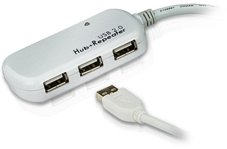 - UE2120H – USB 2.0. Активный Концентратор, Удлинитель ATEN UE2120H позволяет увеличить расстояние между компьютером и USB-устройством/устройствами до 12 метров с помощью активного концентратора-удлинителя.