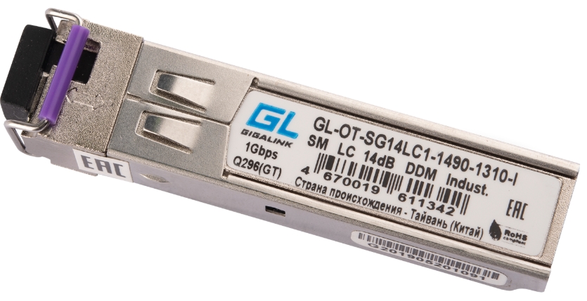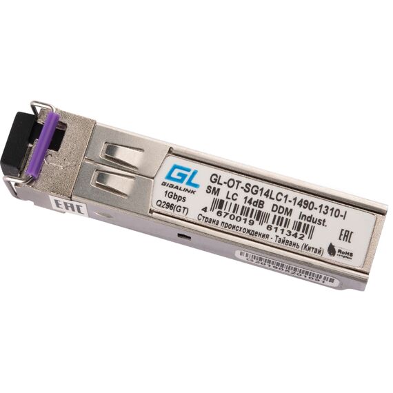 Модуль Gigalink GL-OT-SG14LC1-1490-1310-I SFP, 1.25 Гбит/с, WDM, 1 ОВ, SM, 1xLC, Tx:1490/Rx:1310 нм, DDM, 14 дБ (до 20 км), -40 +85 °С