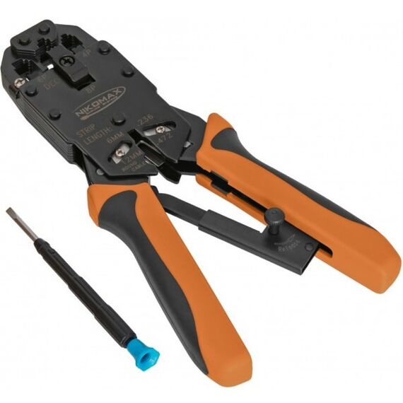 Обжимные инструменты (кримперы) предназначены для обжима коннекторов типа Registered Jack (RJ) на телефонных кабелях и кабелях передачи данных. Кримпер NMC-2008AR предназначен для обжима разъемов типа RJ45/8P8C, RJ12/6P6C, RJ11/6P4C, 4P4C и 4P2C. Инструмент оборудован устройством для зачистки и обрезки кабеля. Данный инструмент является профессиональным, благодаря “торцевому” обжиму и многофункциональности.