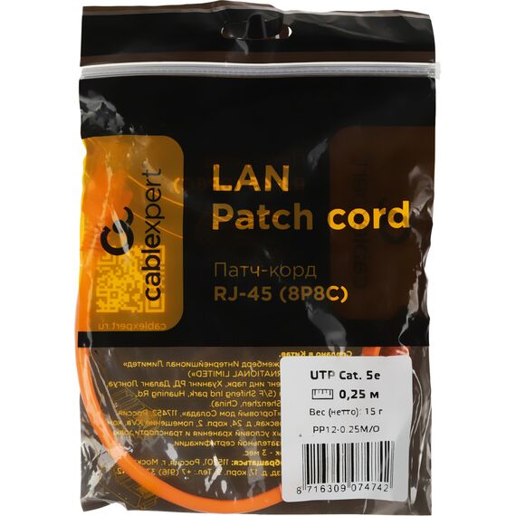 Патч-корд Premier 1000Гбит/с UTP 4 пары cat.5E CCA molded 0.25м оранжевый RJ-45 (m)-RJ-45 (m) [PP12-0.25M/O]