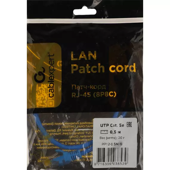 Патч-корд Premier 1000Гбит/с UTP 4 пары cat.5E CCA molded 0.5м синий RJ-45 (m)-RJ-45 (m) [PP12-0.5M/B]