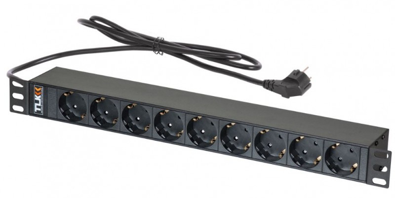 Блок электрических розеток TLK TLK-RSC09-M-04-BK 19", 9 гнезд "евророзетка", макс. нагрузка 16 А, шнур питания 1,8 метра, "евровилка", сечение 3*1,5 мм2, металлический корпус, макс. мощность 4000 Вт, Ш483хВ44хГ44 мм