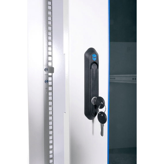 Стандартно шкафы комплектуются двумя дверями трех видов: цельнометаллической, с тонированным ударопрочным стеклом, и дверью с перфорацией. Двери фиксируются усиленными точечными замками, имеют как правую, так и левую навеску с помощью штырьковых петель установленных в дверях.