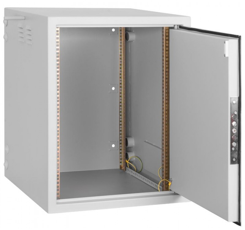 - Настенные антивандальные шкафы серии Secure (TWS) — предназначен для защиты от несанкционированного доступа и кражи, установленного в них телекоммуникационного оборудования. Типичное использование шкафа - на чердаках, в подвалах и коммунальных зонах зданий. Особенностью настенных шкафов серии TWS является антивандальная конструкция, изготовленные из листовой стали 2 мм корпус и дверь, а так же замок повышенной надежности и секретности. Конструкция корпуса и двери — цельносварная, усиленная. Крепление шкафа к стене осуществляется через усиленные монтажные отверстия. Мощная, двухслойная дверь утоплена внутрь, что исключает возможность силового открытия при помощи фомки. Дверь снабжена 5-ригельным замком повышенной секретности. (В комплект входят 4 ключа). Шкаф снабжен 4-мя оцинкованными монтажными направляющими, регулируемыми по глубине, что позволяет устанавливать достаточно тяжелое и габаритное оборудование. На боковых стенках имеются по 4-е защищенных кабельных ввода диаметром 36 мм, закрытые резиновыми заглушкам. Жалюзийные вентиляционные отверстия, расположены на разных уровнях боковых стенок, обеспечивают хорошую вентиляцию устанавливаемого оборудования. С внутренней стороны шкафа вентиляционные отверстия имеют дополнительную защиту в виде стальных кожухов. На одной из боковых стенок внутри шкафа предусмотрено посадочное место под установку вентилятора размером 120х120х38 мм. Все токопроводящие части шкафа заземлены между собой. Для удобства переноски и монтажа предусмотрены легкосъемные ручки. При необходимости размещения шкафа на пол, в основании шкафа имеются отверстия для установки регулируемых по высоте опор. (В комплект поставки не входят). Антикоррозионное покрытие выполнено ударопрочной порошковой краской. Шкаф выполнен в системе несущих конструкций серии 482,6 мм ГОСТ 28601-90 (19-дюймовому стандарту IEC 297). Максимальная допустимая распределенная нагрузка на шкаф серии TWP составляет 150 кг. Степень защиты шкафа составляет IP 31. Шкаф поставляется в собранном виде.