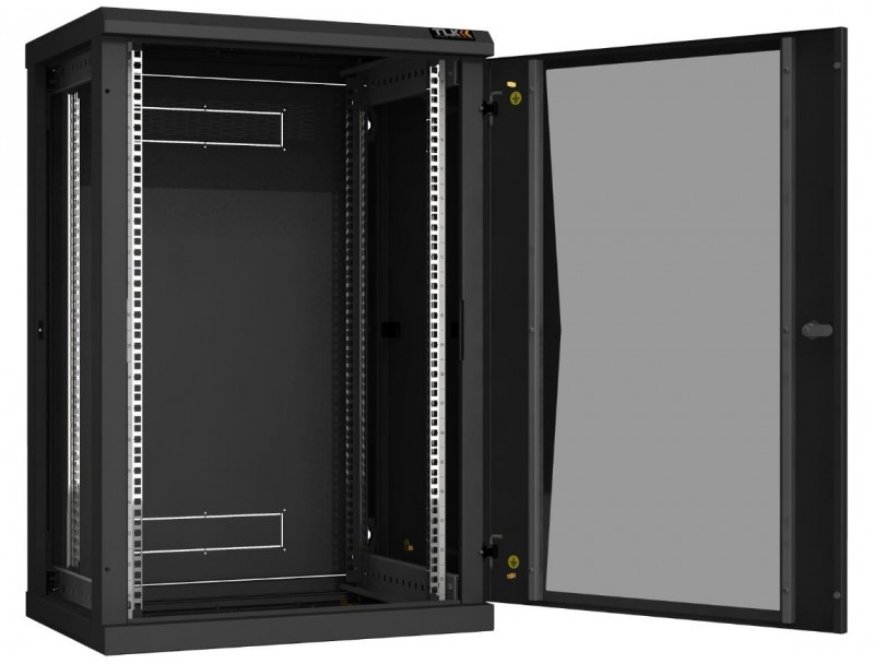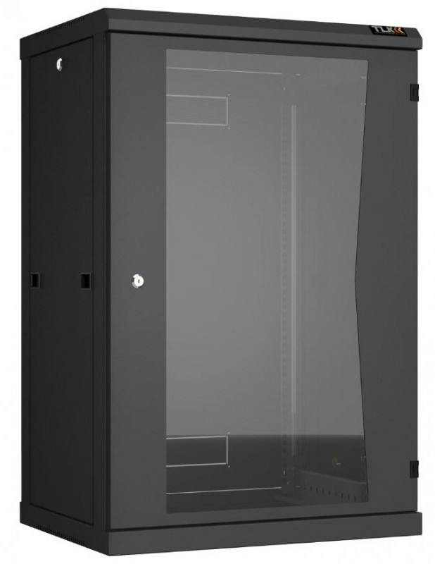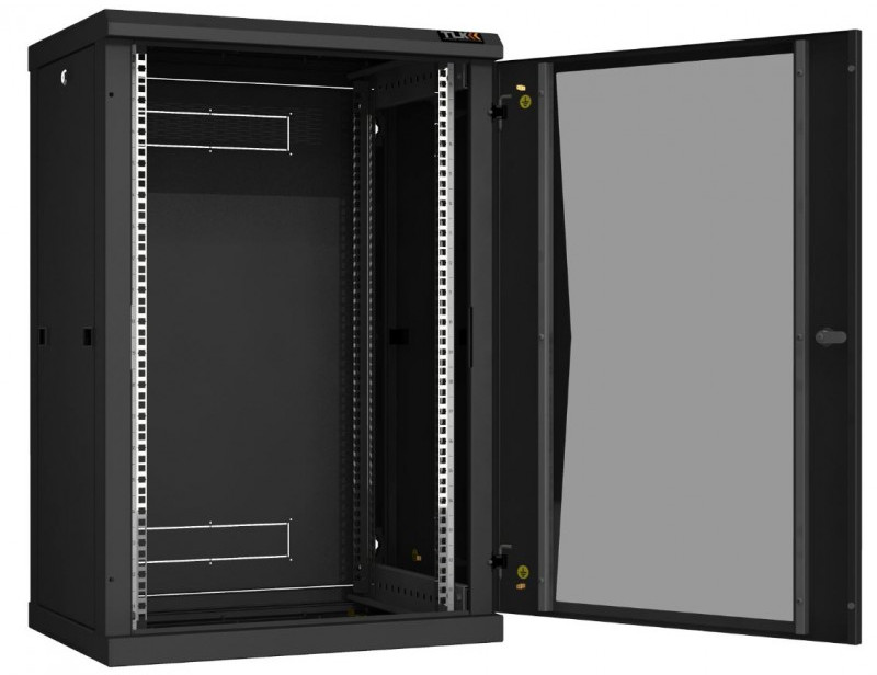 Настенный разборный шкаф TLK TWC-186045-R-G-BK 19", 18U, стеклянная дверь, Ш600хВ904хГ450мм, 2 пары монтажных направляющих, черный