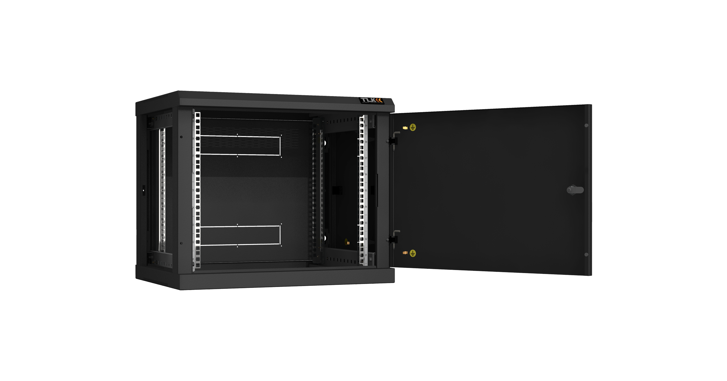 Для крепления шкафа к стене в задней раме выполнены четыре монтажных отверстия, под анкерные болты М8. Для шкафа предусмотрены аксессуары TLK предоставляющие возможность, размещение шкафа на полу на регулируемых опорах TLK, а также изменение конструкции шкафа из односекционного в двухсекционный при помощи пристенной поворотной секции TLK. Все токопроводящие части шкафа заземляются между собой, образуя единый контур заземления. Антикоррозионное покрытие шкафа выполнено ударопрочной порошковой краской.