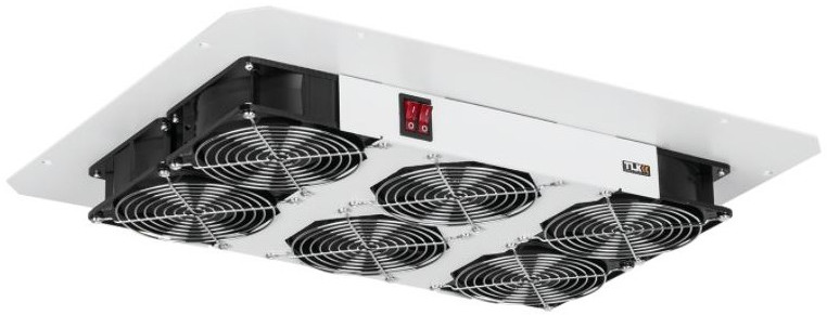 Вентиляторный блок предназначен для принудительного охлаждения активного оборудования, установленного в телекоммуникационном шкафу, путем отвода теплых воздушных масс из внутреннего объем шкафа. Блок устанавливается в специальные ниши на крыше или в основании напольных шкафов TLK и совместимы с сериями TFE, TFL, TFR, TFA. При этом шкафы глубиной (600 мм) предусматривают только верхнее размещение вентиляторного блока. Для более подробной информации сверьтесь с таблицей в разделе "Описание" к шкафу. Питание вентиляторного блока на 2 вентилятора осуществляется с помощью подключения шнура питания к сети с напряжением 220 В, 50 Гц. Разъем питания на вентиляторном блоке типа IEC-60320 C14. Вентиляторы закрыты решетками с обеих сторон. Блоки с маркировкой «F» также имеют встроенные фильтры для предотвращения засасывания пыли во внутреннее пространство шкафа. Вентиляторные блоки конструктивно выполнены с монтажным фланцем для удобства установки. Несущая конструкция вентиляторных блоков выполнена из 2 мм стали и оснащена четырьмя или шестью вентиляторами. Антикоррозионное и декоративное покрытие выполнено ударопрочной порошковой краской светло-серого или черного цвета.