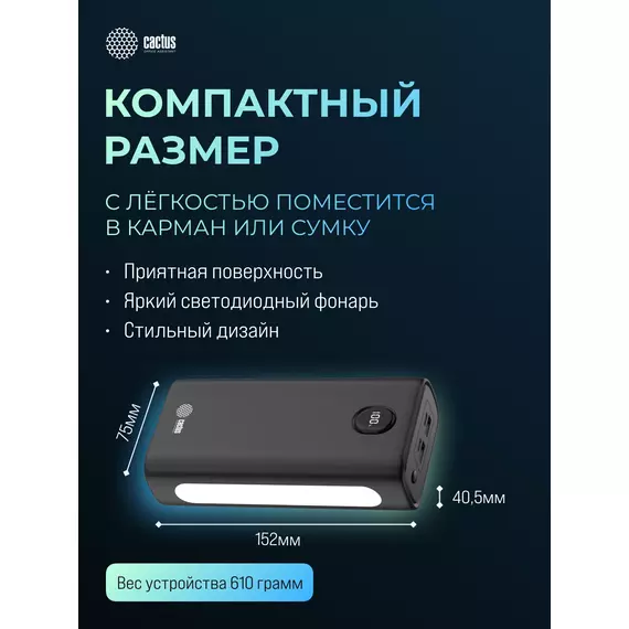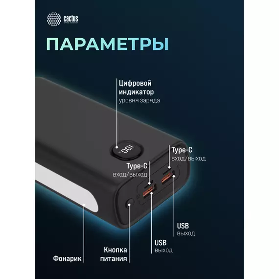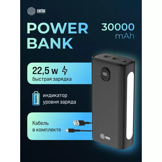 Мобильный аккумулятор Cactus CS-PBFSJA-30000 30000mAh 22.5W 4.5A 2xUSB-A/2xUSB-C черный