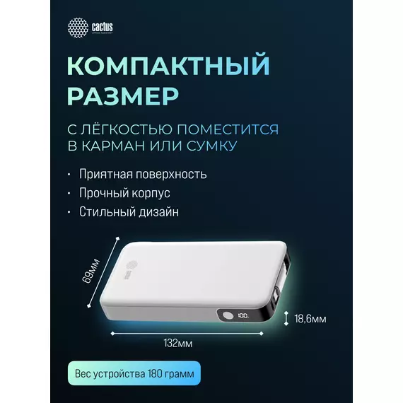 Мобильный аккумулятор Cactus CS-PBFSPA-10000 10000mAh 22.5W 4.5A 2xUSB-C белый