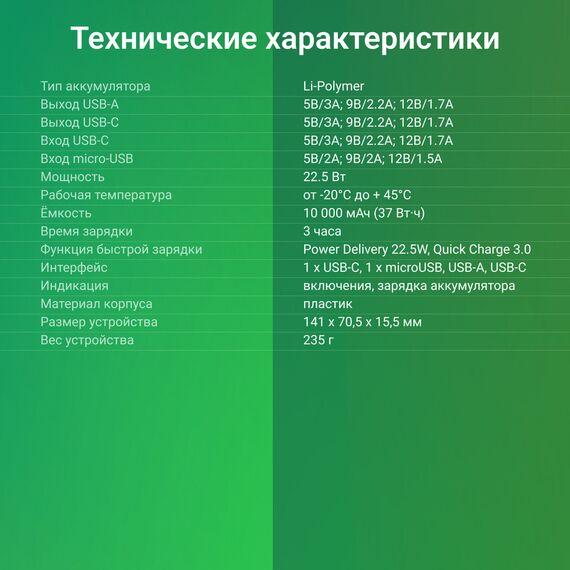 | Выходные разъемы на корпусе | USB-A/USB-C |