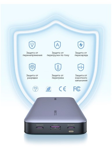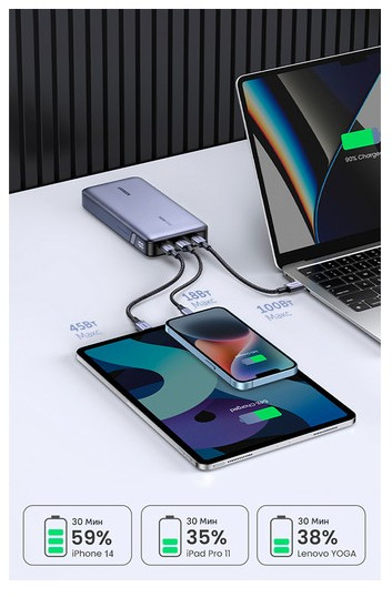 - USB-C1+USB-A общая выходная мощность: 100W+22.5W