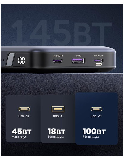 - USB-C1+USB-C2 общая выходная мощность: 100W+45W