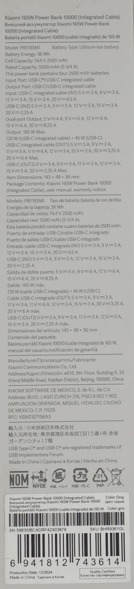 Мобильный аккумулятор Xiaomi BHR9361GL 10000mAh QC/PD 165W 6A USB-C серый