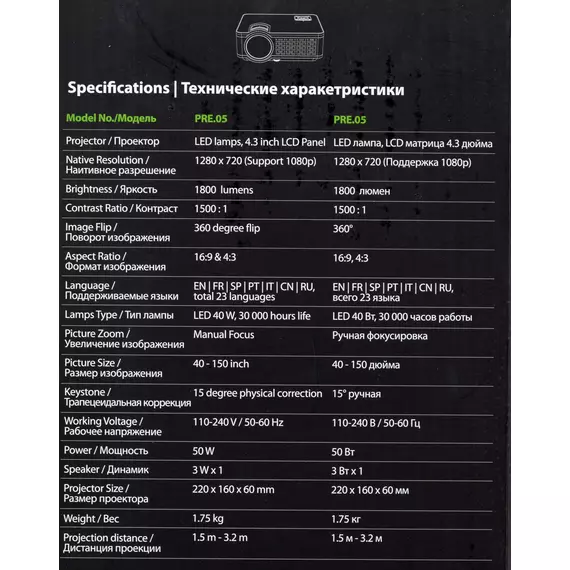 | Проекционное расстояние | 1.5-3.2м |